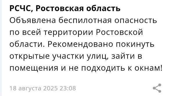 Вечером в понедельник, 18 августа, в Ростовской области объявлена беспилотная опасность.