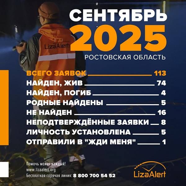 В сентябре в Ростовской области пропало 113 человек, четверо найдены погибшими. Свою статистику опубликовал поисковый отряд «ЛизаАлерт».
