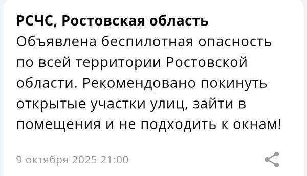 Экстренное предупреждение о беспилотной опасности распространено РСЧС в 21:00 четверга, 9 октября.