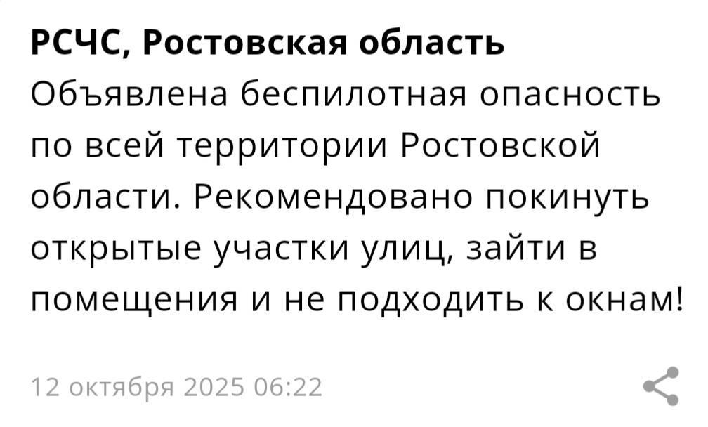 В Ростовской области рано утром, 12 октября, объявлена беспилотная опасность