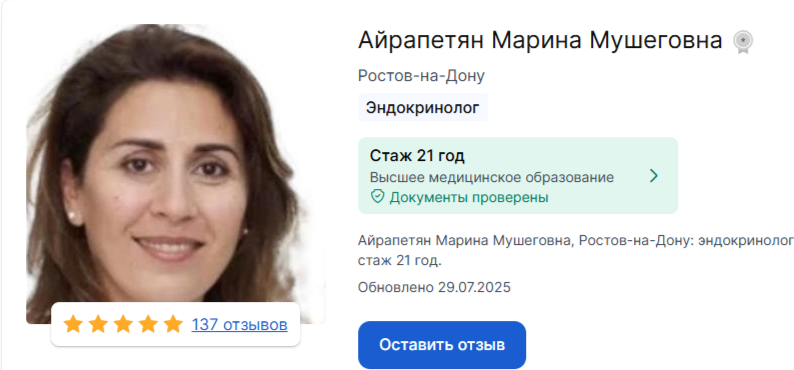 Марина Айрапетян проработала эндокринологом 21 год. На ее страничке 137, в большинстве своем положительных и благодарственных отзывов пациентов.