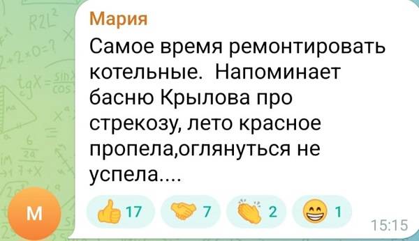 Появились положительные новости: подрядные организации «уже приступили к работам». ООО «Строительное управление-310» заключило муниципальные контракты на ремонт 11 участков теплосетей общей протяженностью 4 километра, а также на капремонт котлов.