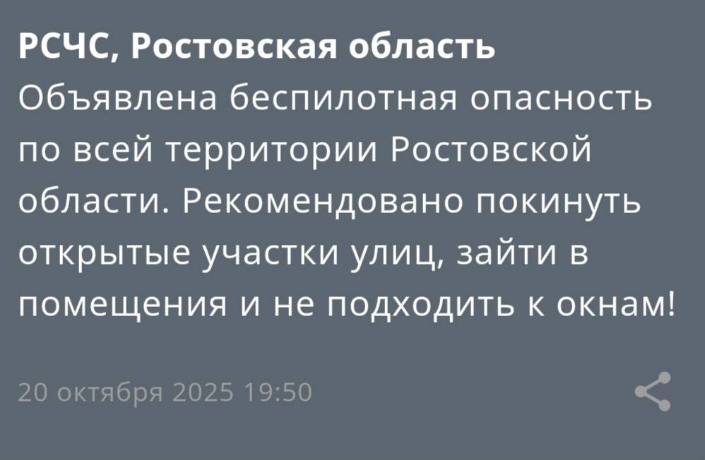 В Ростовской области вечером в понедельник, 20 октября, объявлена беспилотная опасность. Экстренное сообщение РСЧС было обнародовано в 19:50.