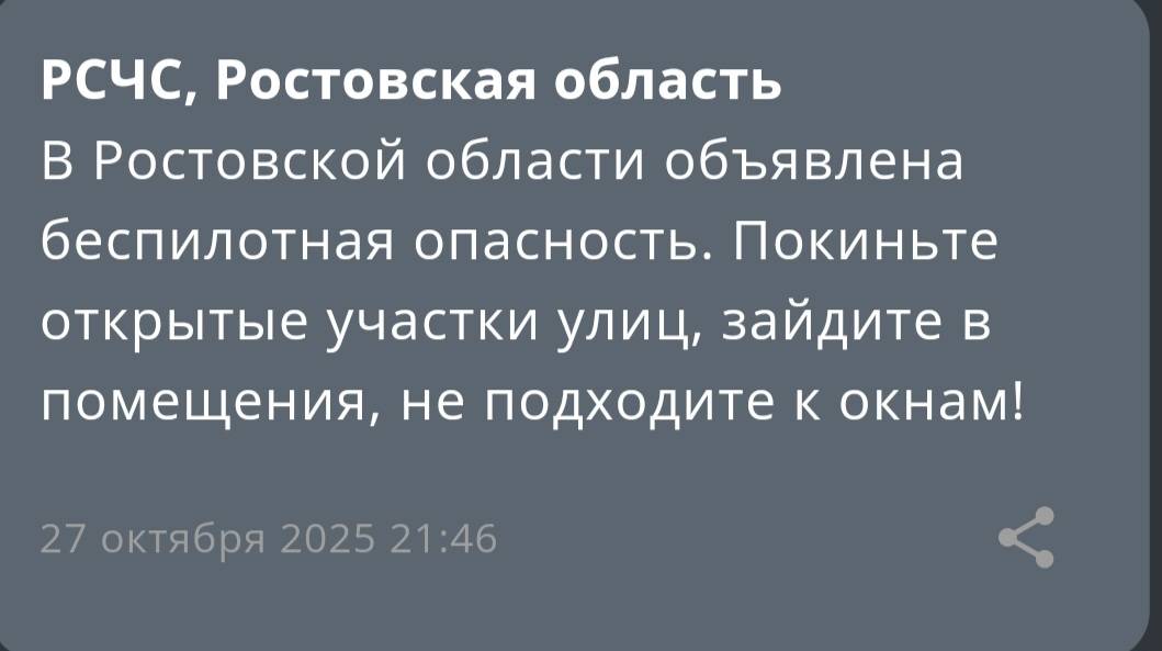 На Дону вечером 27 октября объявлена беспилотная опасность