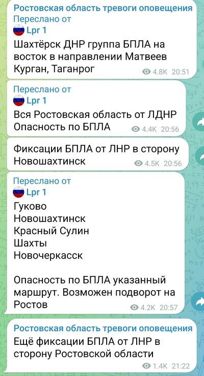 Начиная с 20:50 в мониторинговых каналах стали появляться сообщения о движении украинских БПЛА в сторону Донского региона.