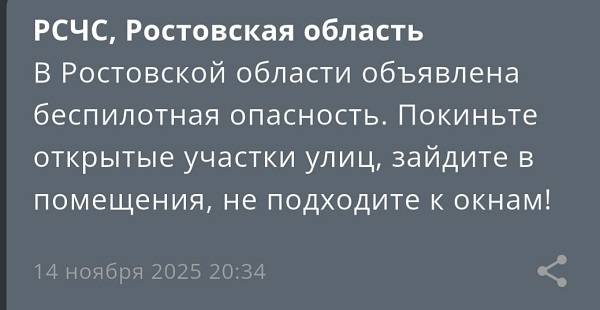 В Ростовской области объявлена беспилотная опасность вечером 14 ноября.