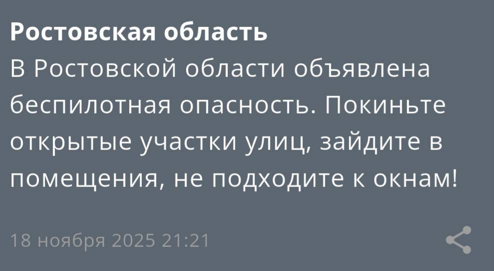 Эктренное сообщение о беспилотной опасности на всей территории Ростовской области распространено РСЧС в 21:21 во вторник, 18 ноября.