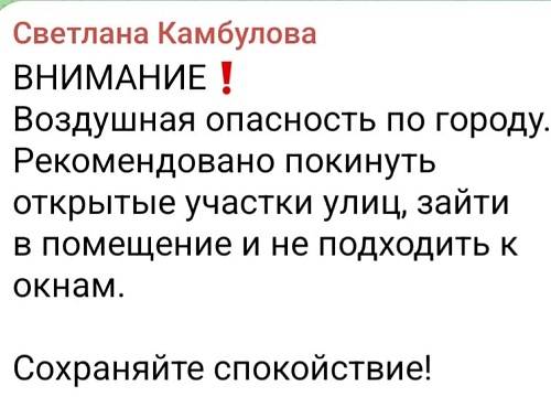 О воздушной опасности по городу объявила его глава Светлана Камбулова.