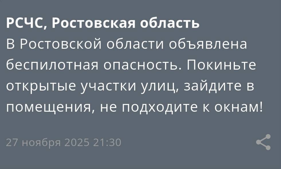 На территории Донского региона вечером 27 ноября объявлена беспилотная опасность.