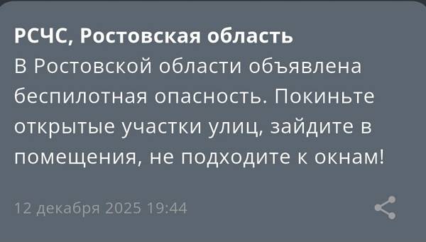 В Ростовской области вечером 12 декабря объявлена беспилотная опасность