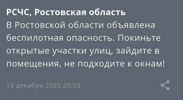 Экстренное предупреждение от РСЧС о беспилотной опасности было распространено в 20:03 в субботу, 13 декабря.