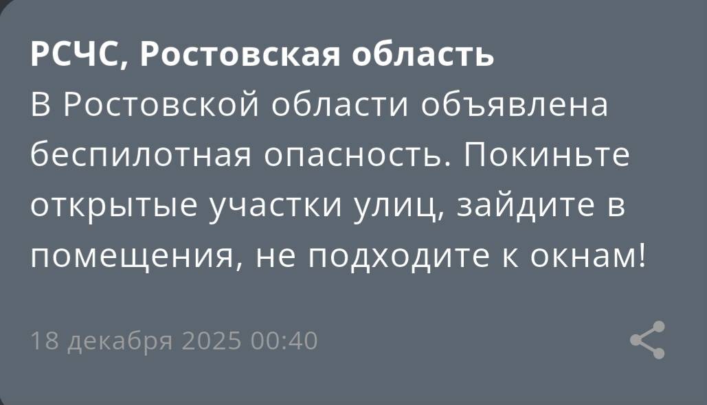 В Ростовской области в ночь на 18 декабря объявлена беспилотная опасность