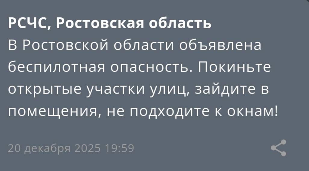 В Ростовской области в субботу вечером, 20 декабря, объявлена беспилотная опасность