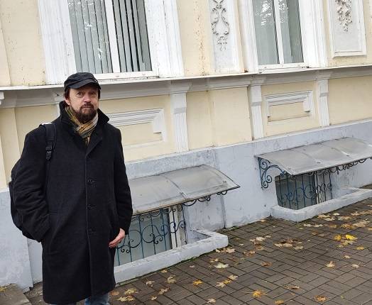 На фото куратор выставки В. Назанский у бывшей мастерской Л. Стуканова в Таганроге.