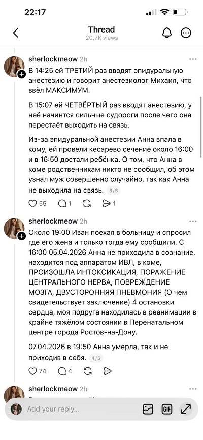 В министерстве выразили глубокие соболезнования родным и близким погибшей, отметив, что врачи предприняли все возможные действия для спасения роженицы, включая привлечение специалистов областного Минздрава и Национального медицинского исследовательского центра акушерства и гинекологии им. В.И. Кулакова.