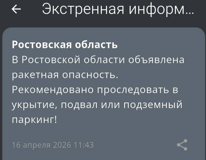 Утром 16 апреля в Ростовской области объявили ракетную опасность.